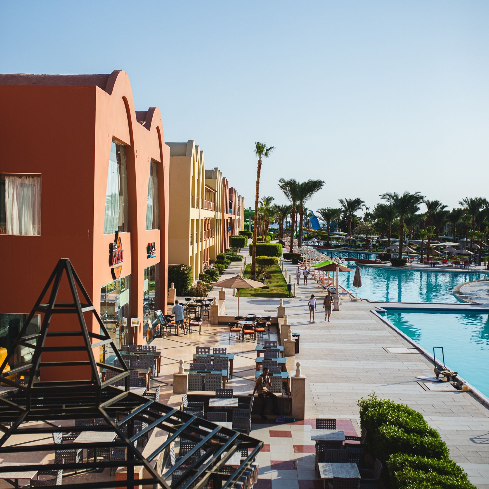 Намира се на 12 км. от летище Хургада, на 17 км. от центъра на Хургада, на брега на морето.