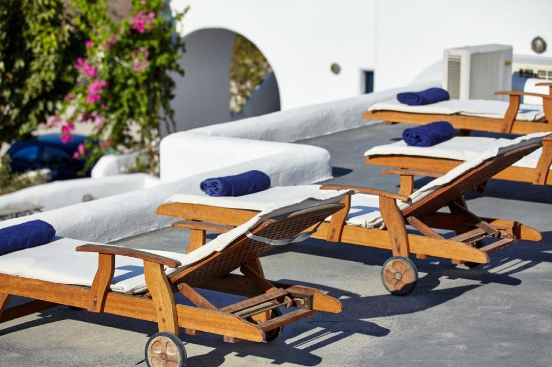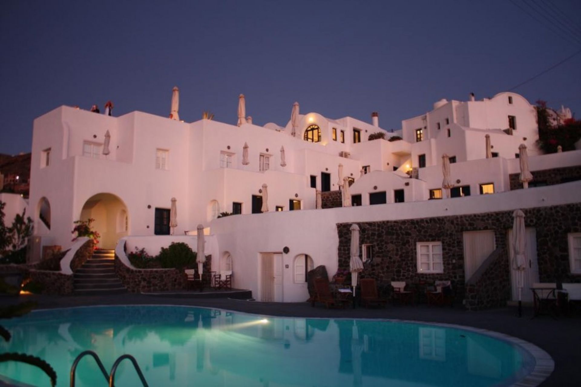 Белият хотел е построен в традиционен цикладски стил. Хотелът разполага с 24 стаи. Всички стаи са оборудвани с климатик, телефон, баня с душ, сешоар, сейф, балкон или тераса с изглед към известния залез на Санторини.
