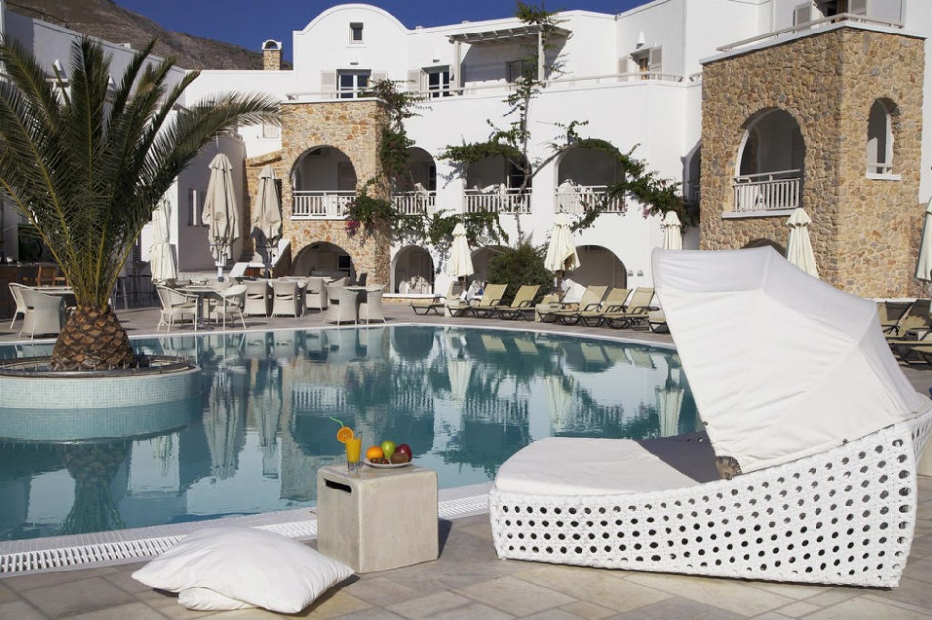 Хотелът се намира на 9 км от столицата Фира, в селището Камари, на 50 м. от брега на морето. Построен през 2001 - 2002 г. в традиционна цикладска архитектура и изцяло реновиран през 2014 г.
