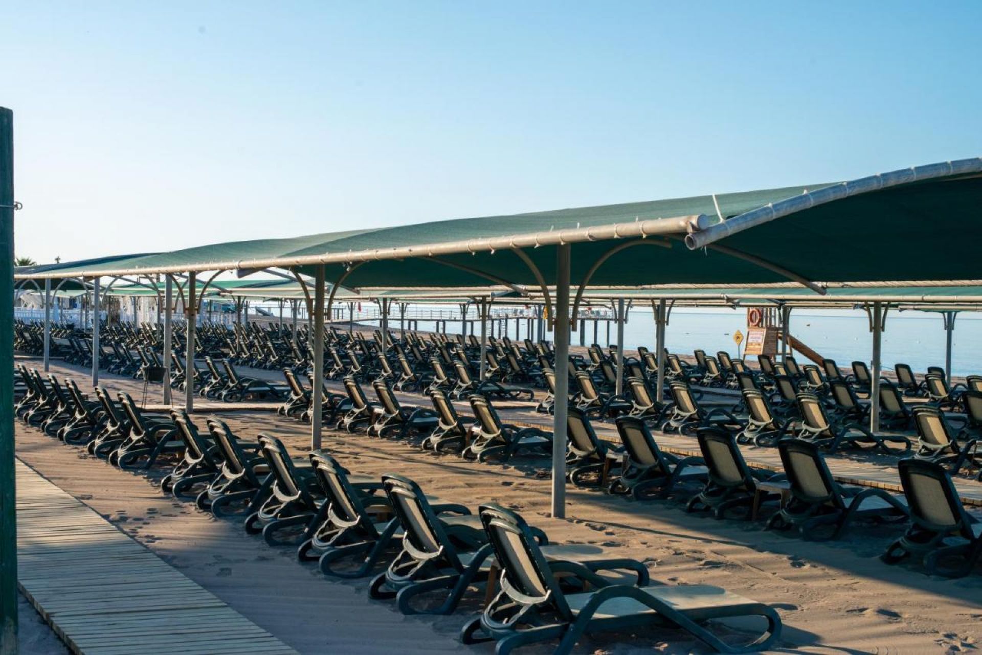 Собствен, пясъчно - чакълест. Чадъри, шезлонги и плажни кърпи на плажа и при басейна – безплатно.