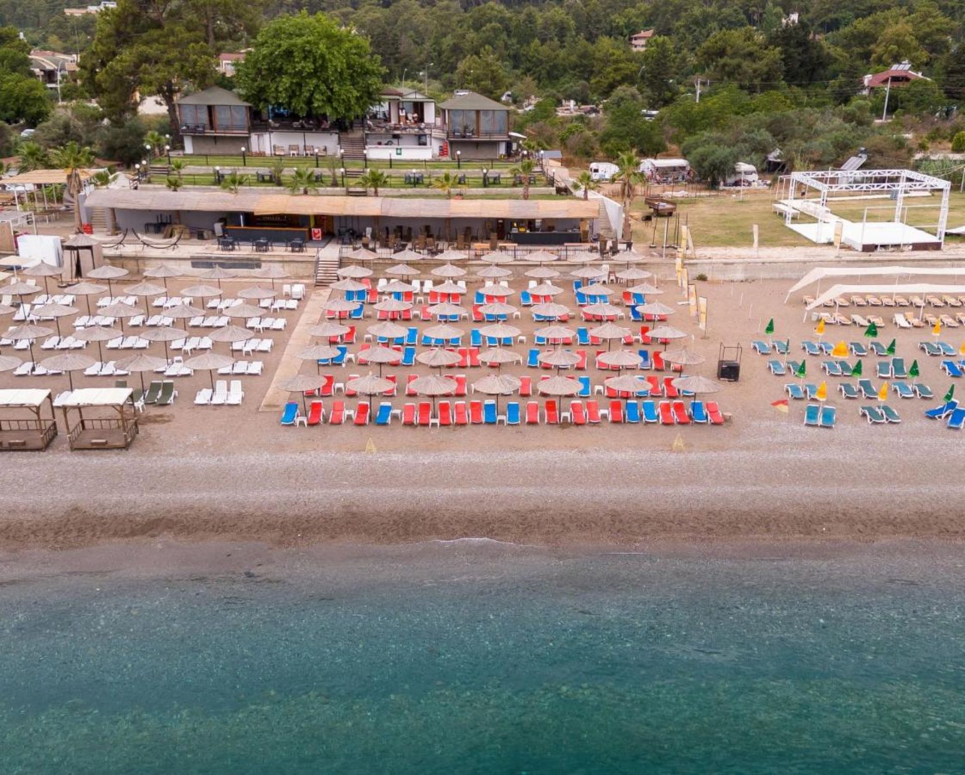 Собствен, пясъчно - чакълест. Чадъри, шезлонги и плажни кърпи на плажа и при басейна – безплатно.