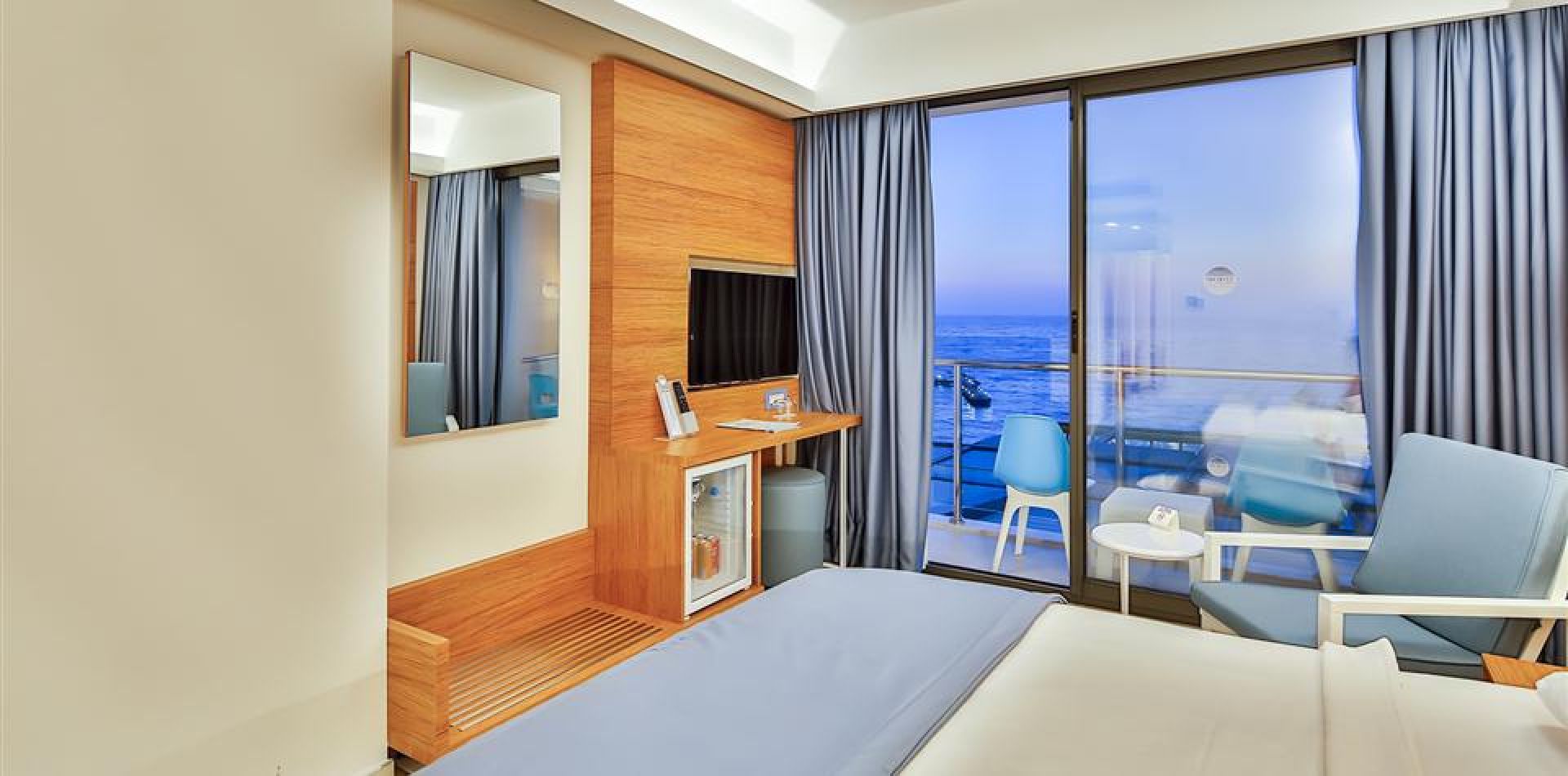 Хотелът разполага с общо 330 стаи, от които Promo Room Garden View (25-30 m²), Standart Room Garden View (25-30 m²), Standart Room Sea View (25-30 m²), Large Garden View Room (1 спалня и единично легло - 35-40 m²), Large Sea View Room (1 спалня и единично легло - 35-40 m²), Family Room (2 спални, 2 бани - 50-60 m²). Всички са оборудвани с климатик, телевизор, телефон, баня с душ, сешоар, сет за кафе/ чай, минибар (безплатен, зареждане всеки ден), сейф (безплатен), Wi-Fi, балкон. Почистване на стаите и смяна на кърпите – всеки ден, смяна на бельото – 2 пъти в седмицата.
