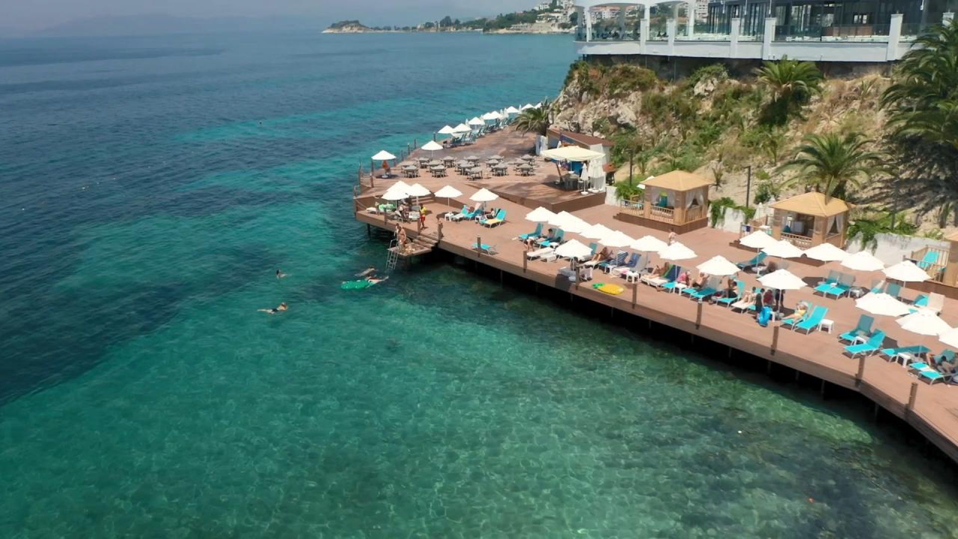 Собствен, пясъчен и платформа. Чадъри, шезлонги и плажни кърпи на плажа и при басейна – безплатно.