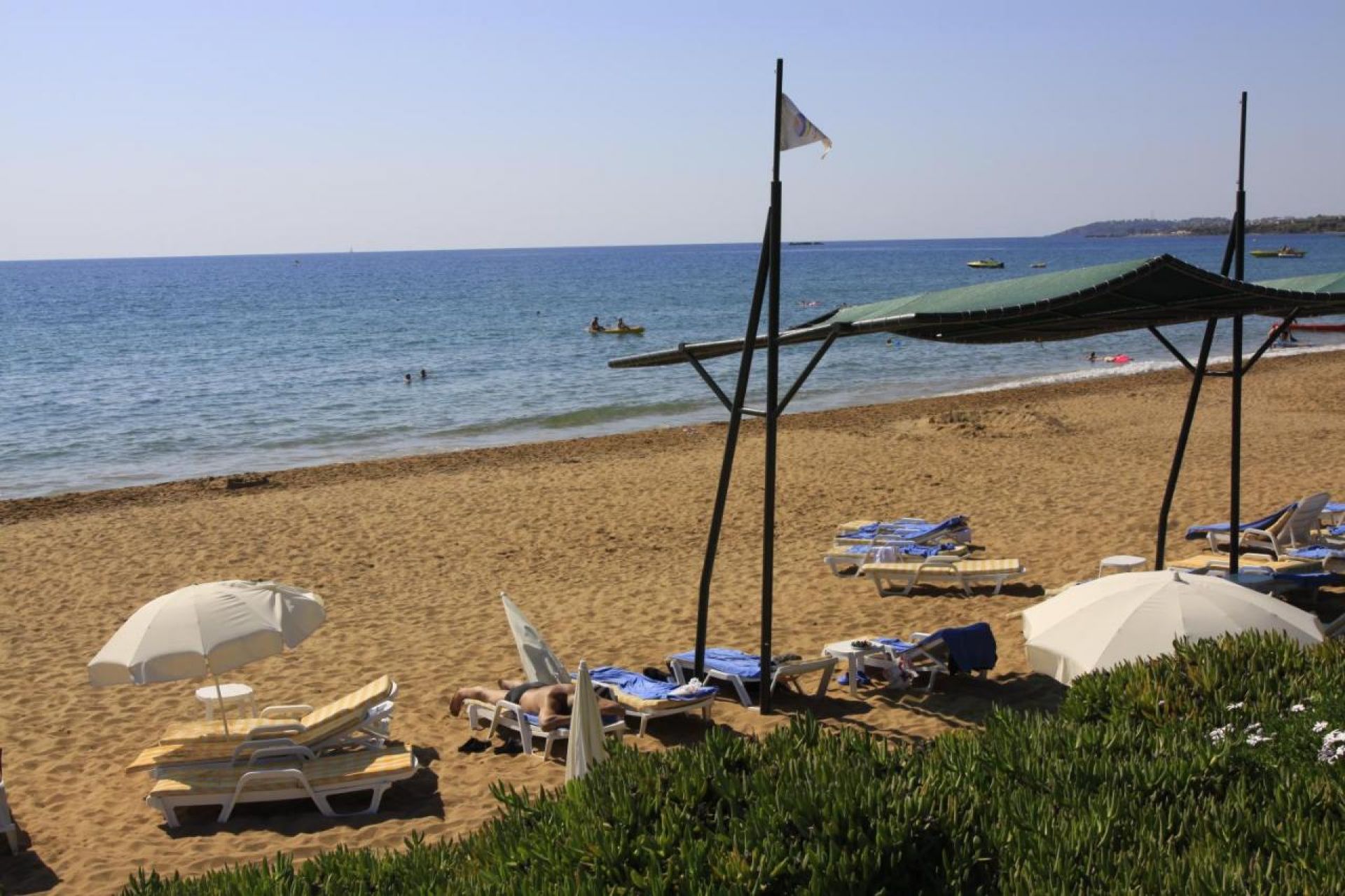 ПЛАЖ: Собствен, пясъчен, удостоен със сертификат Син Флаг за изключително чиста вода. На басейна и на плажа: чадъри, шезлонги, матраци – безплатно. Плажни хавлии: безплатно.