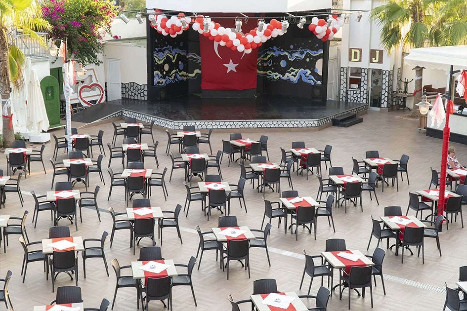 Основен ресторант с капацитет 450 места, външен ресторант - 250 места, снек бар, 2 Ала карт ресторанта -рибен и турски - с предварителна резервация. Лоби бар, бар на плажа, сладкарница, дискотека, 2 открити басейна и 1 закрит.