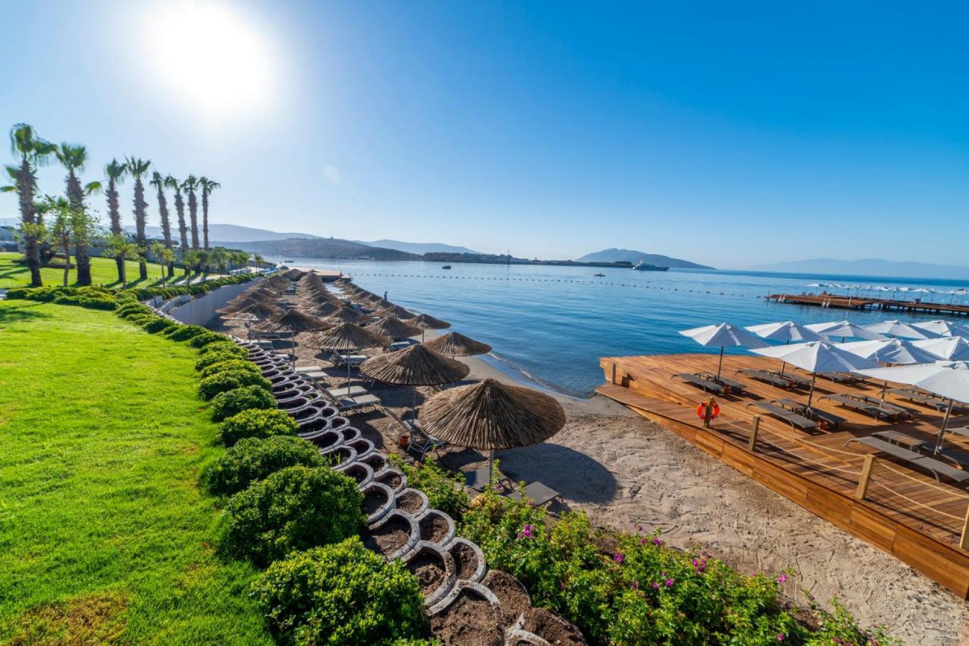 Собствен пясъчен плаж и платформа. Чадъри и шезлонги на плажа и при басейна - безплатно.