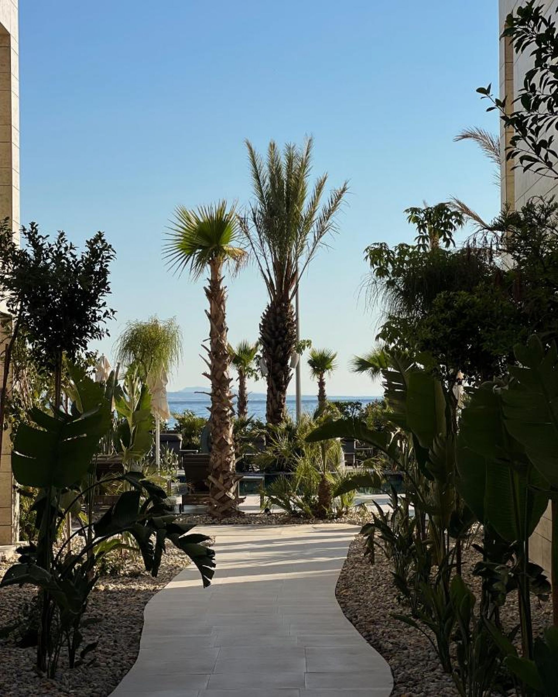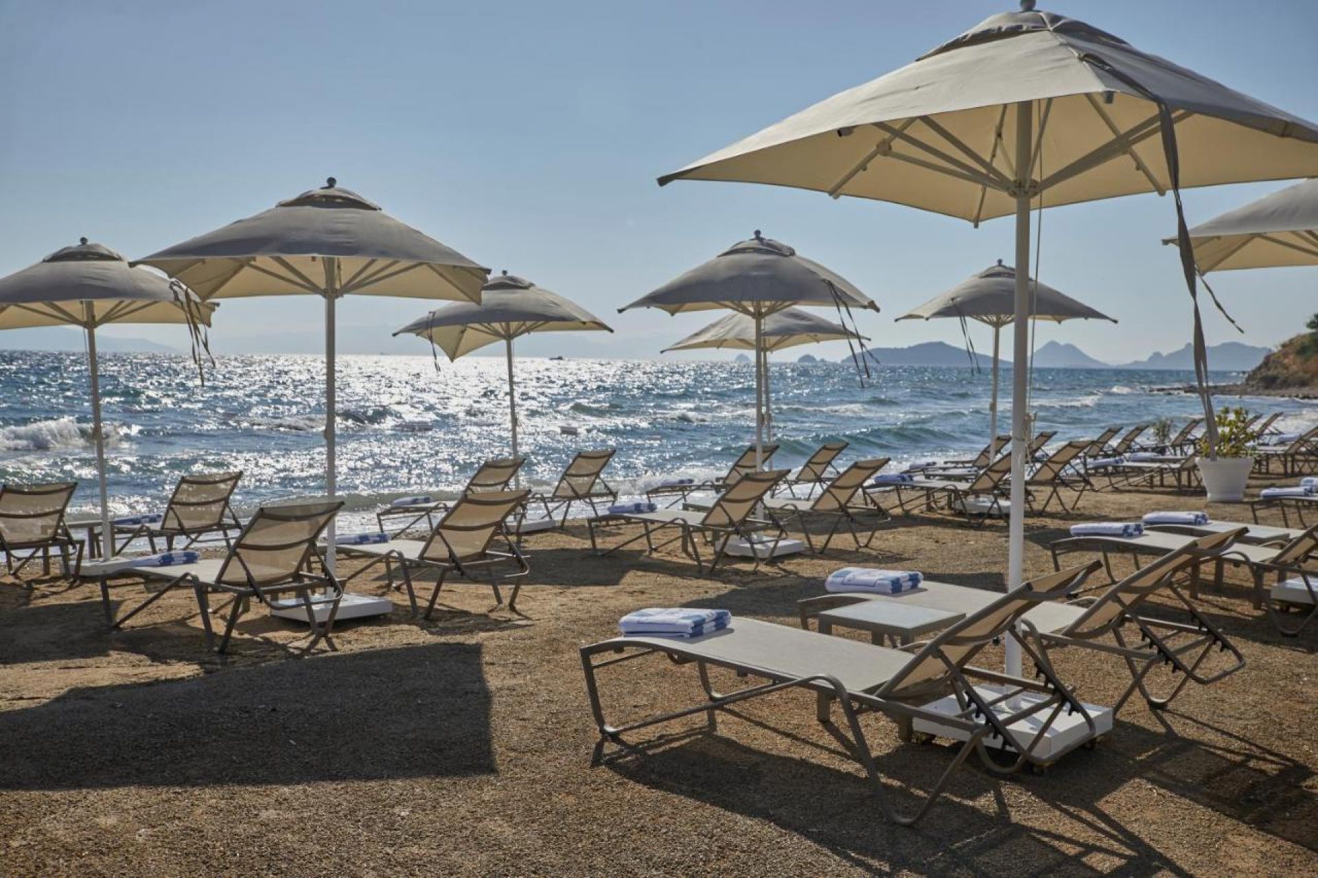 Собствен, пясъчно-чакълест. Чадъри и шезлонги на плажа и при басейна - безплатно.