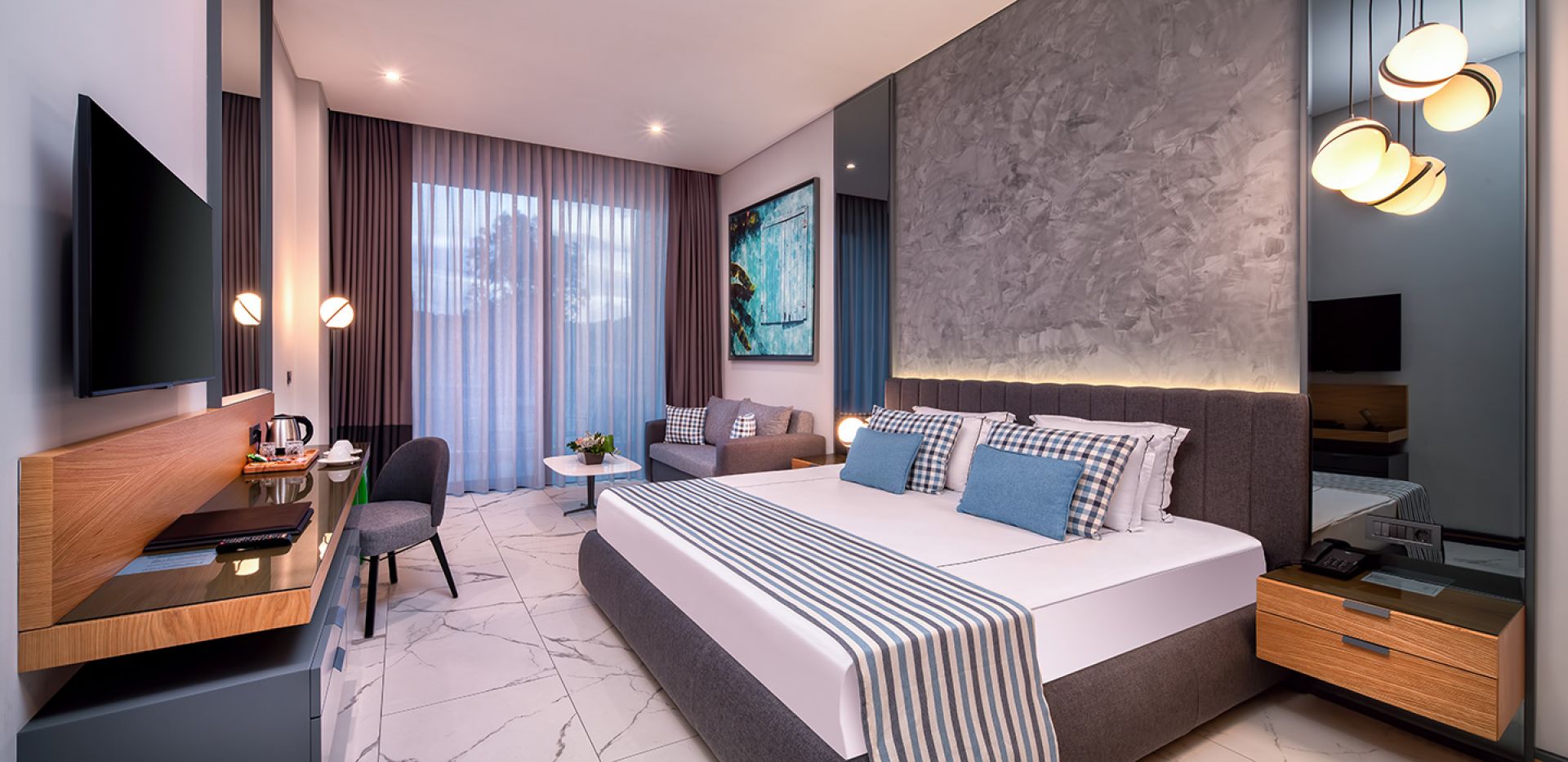 Всички стаи са оборудвани с телевизор, климатик, сешоар, вана / душ, сейф, мини бар (зарежда се всеки ден - безплатен), сет за кафе и чай, меню за възглавници.